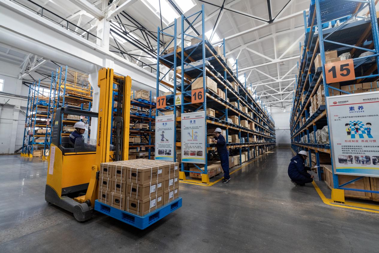 图为物资供应中心大柳塔物资库仓储管理员正在开展物资盘点、上架工作。该中心通过“严审”“优储”双管齐下,从源头实现降本增效,优化储备结构。(刘长江 摄)