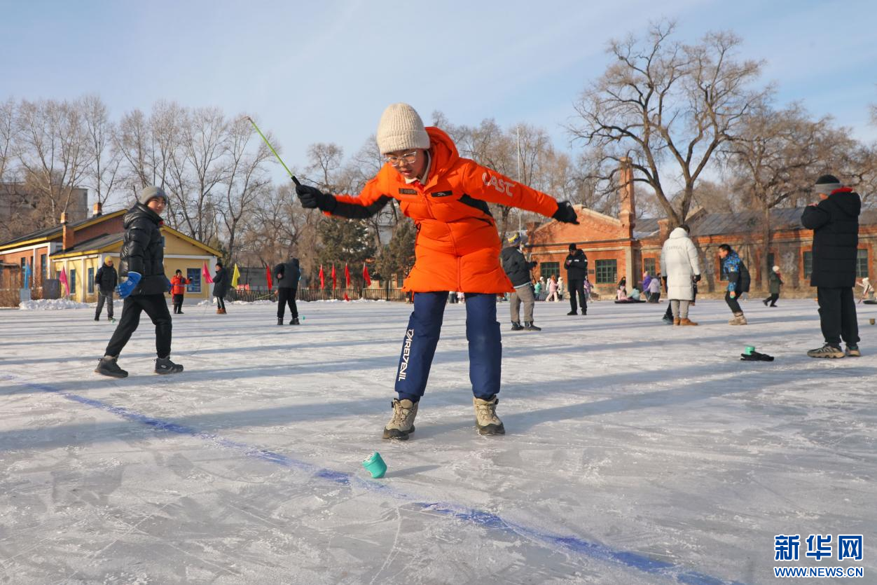 12月18日,在内蒙古自治区呼伦贝尔市扎兰屯市实验小学冰场,学生们在“冰雪课堂”上打冰嘎。新华网发(韩颖群 摄)