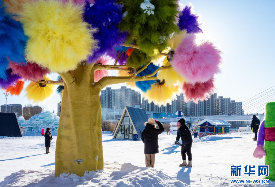 12月21日,游客在呼伦贝尔市海拉尔区伊敏河文化休闲长廊拍照。新华网发(吕昊俊 摄)