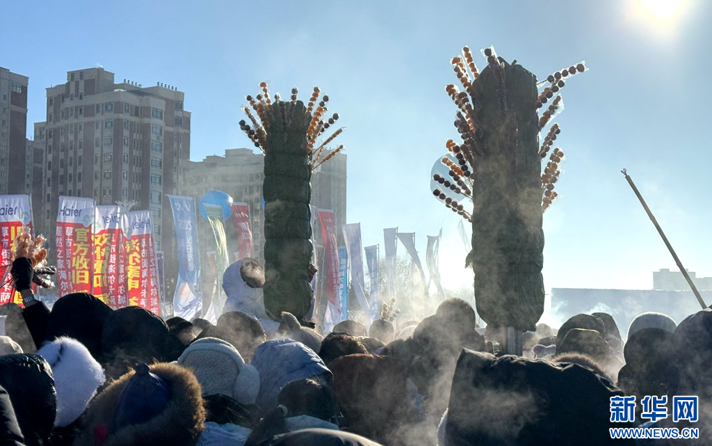 12月21日,市民、游客在第二十一届内蒙古自治区冰雪那达慕开幕式现场,免费领取冰糖葫芦。新华网 李倩摄