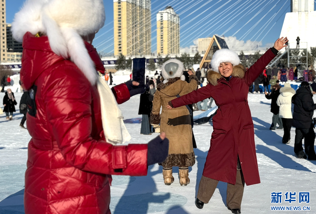 12月21日,游客在第二十一届内蒙古自治区冰雪那达慕开幕式现场拍照留念。新华网 李倩摄