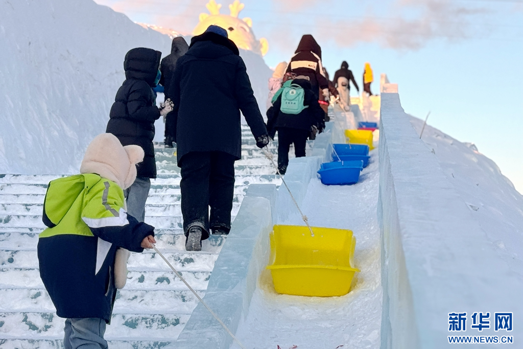 12月20日,市民、游客在呼伦贝尔绒绒雪世界冰滑梯游玩。新华网 李倩摄