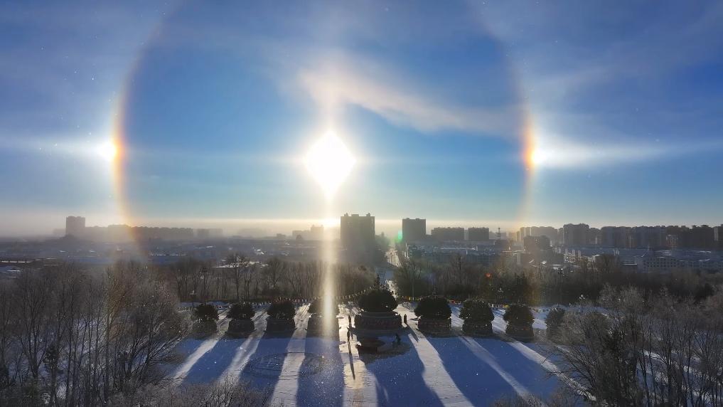 近日,锡林浩特迎来入冬后的最低气温。雪后初霁,朝阳缓缓升起,高空漂浮的雪花冰晶与晨雾相伴交织,经阳光折射形成罕见幻日奇观,天地间光影流转如自然馈赠的美景。