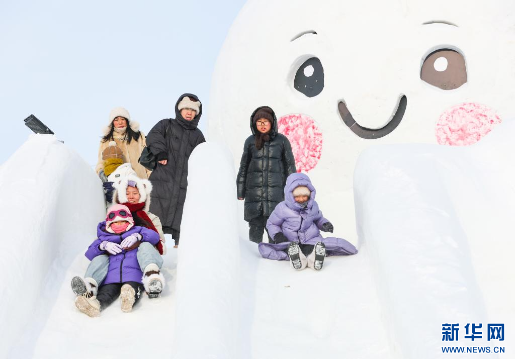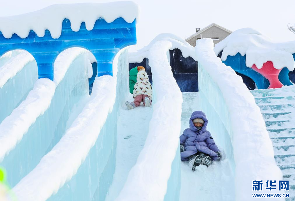 12月20日,游客在“绒绒雪世界”体验冰滑梯。新华网发(康文魁 摄)