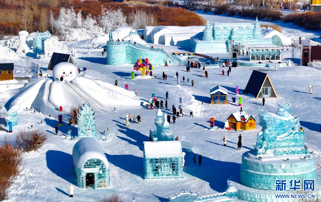 12月20日,游客在“绒绒雪世界”内游玩(无人机拍摄)。新华网发(王正 摄)