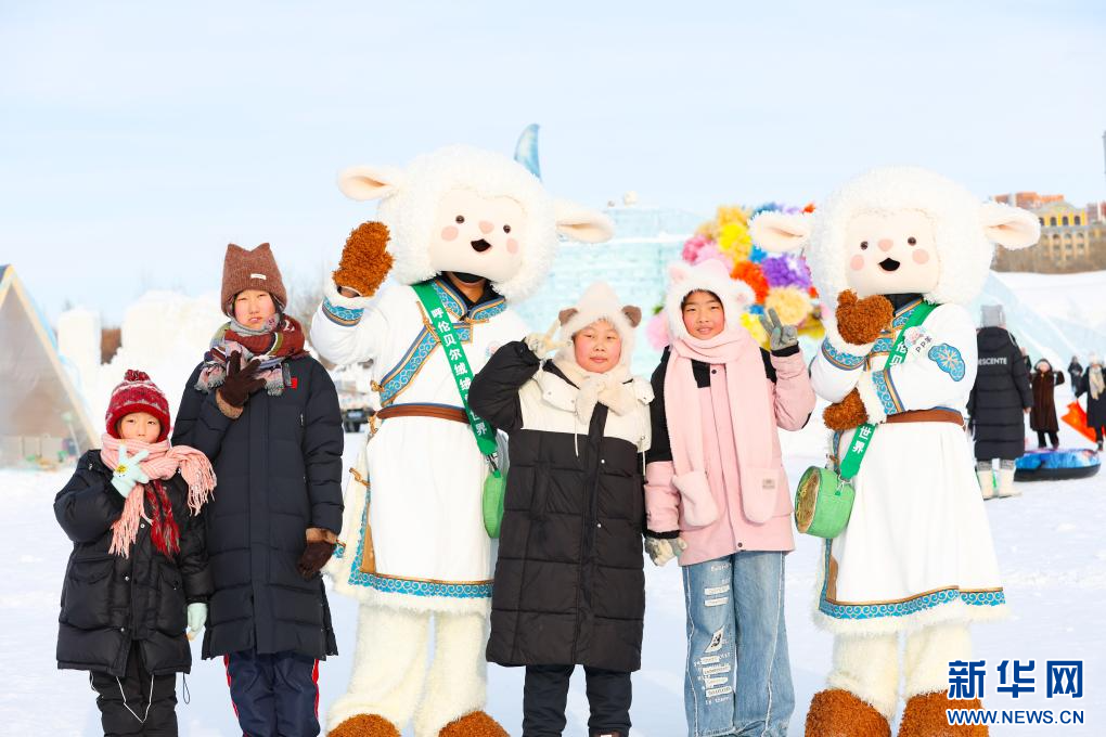 12月20日,游客在“绒绒雪世界”和“呼伦小羊”合影。新华网发(康文魁 摄)