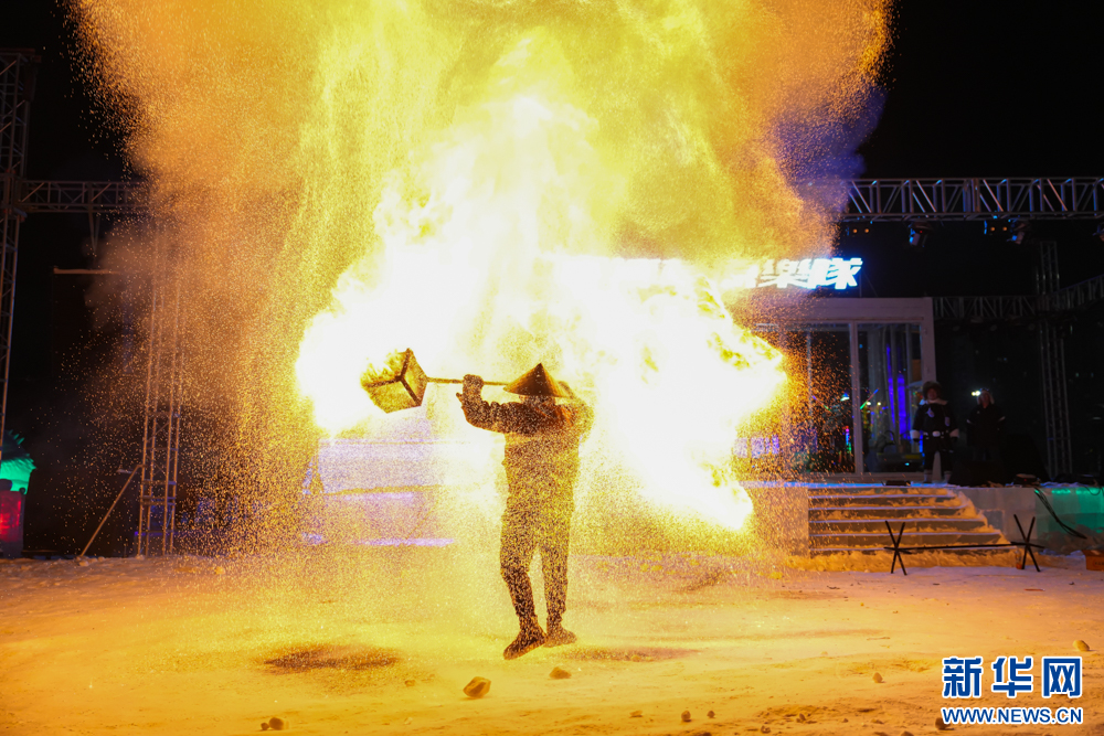 12月20日,艺人在“绒绒雪世界”表演火壶秀。新华网发(张健 摄)