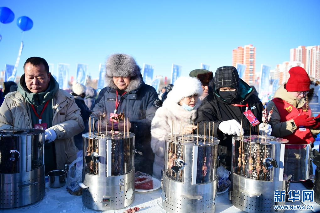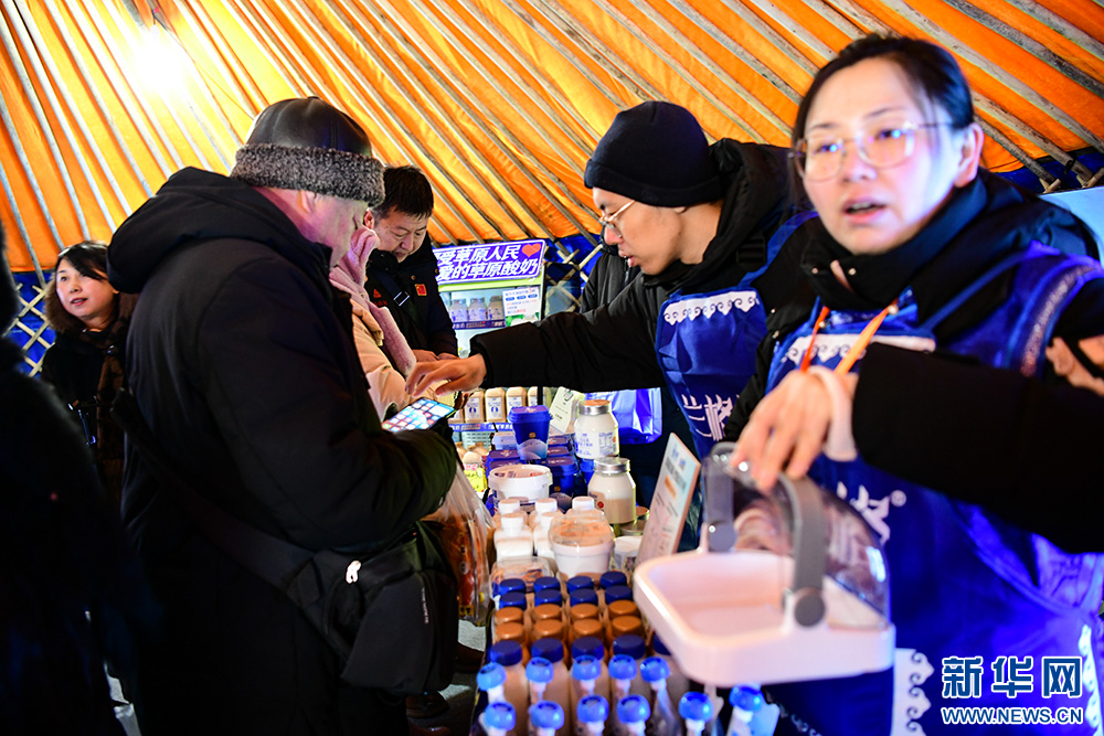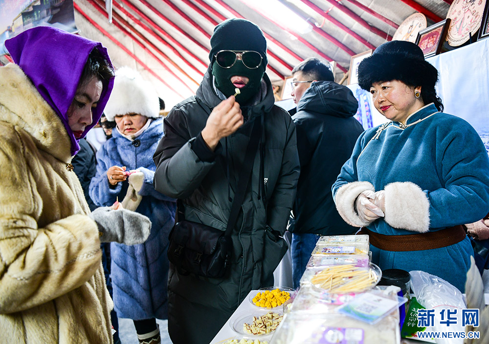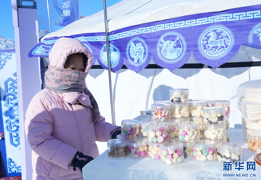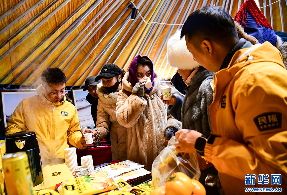 莫力达瓦达斡尔族自治旗——展销以莫力达瓦字体冰箱贴为代表的非遗文创,以及野生榛子、菇娘果汁、奶制品等农副产品,现场提供姜茶、奶茶并免费发放暖贴。