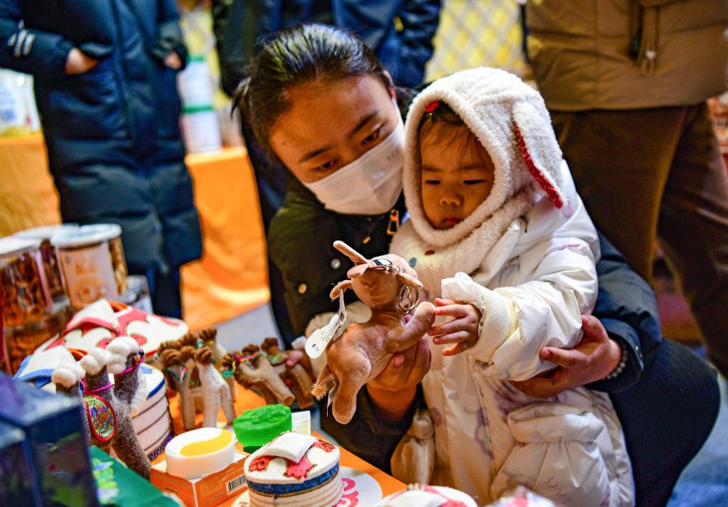 12月27日,游客在驼超联赛现场设置的特色产品店中选购文创产品。(康文魁 摄)