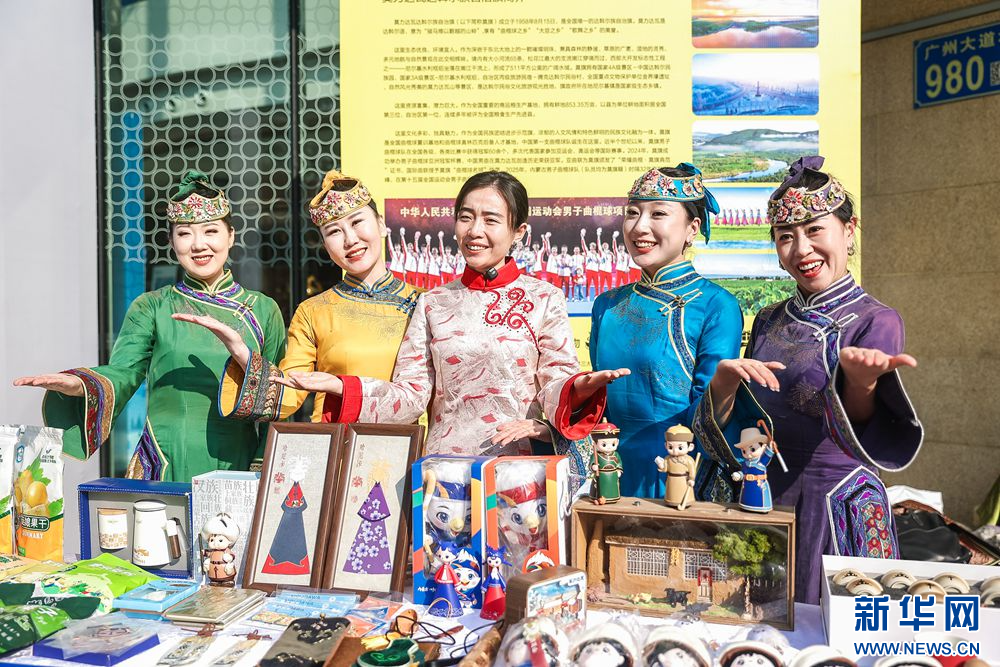 12月28日,在“我和草原有个‘粤’定”——呼伦贝尔大湾区推介会上,呼伦贝尔的文旅推介官们在特色产品展示台前合影留念。新华网发