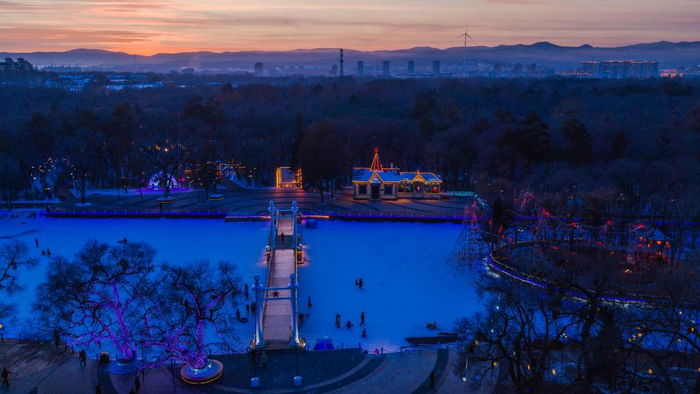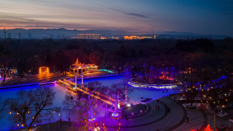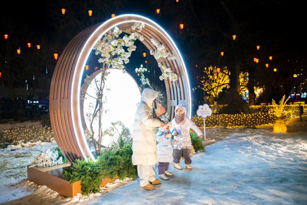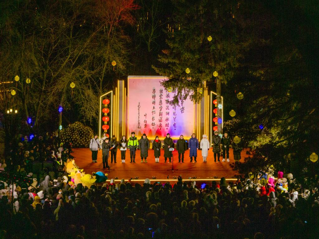 2025年12月31日晚,市民们齐聚在扎兰屯市百年吊桥公园,观灯会迎新年。(王泽蔚)
