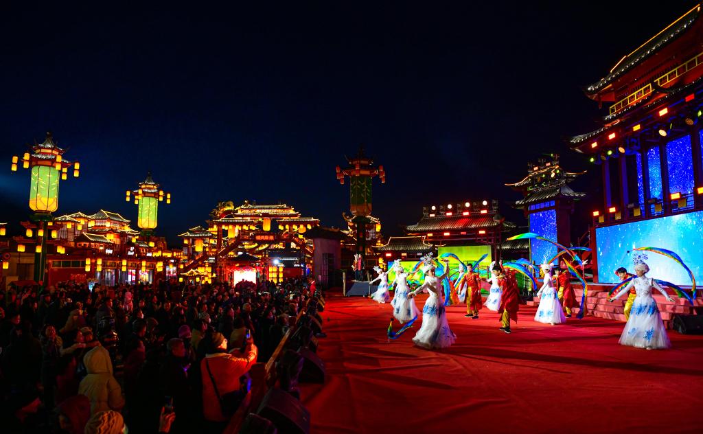 2025年12月31日,演员在美稷·长河里夜未央不夜城表演蒙古族舞蹈。(康文魁 摄)