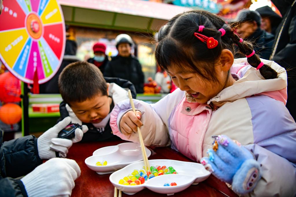 2025年12月31日,市民游客在美稷·长河里夜未央不夜城参与夹弹珠有奖游戏。(康文魁 摄)