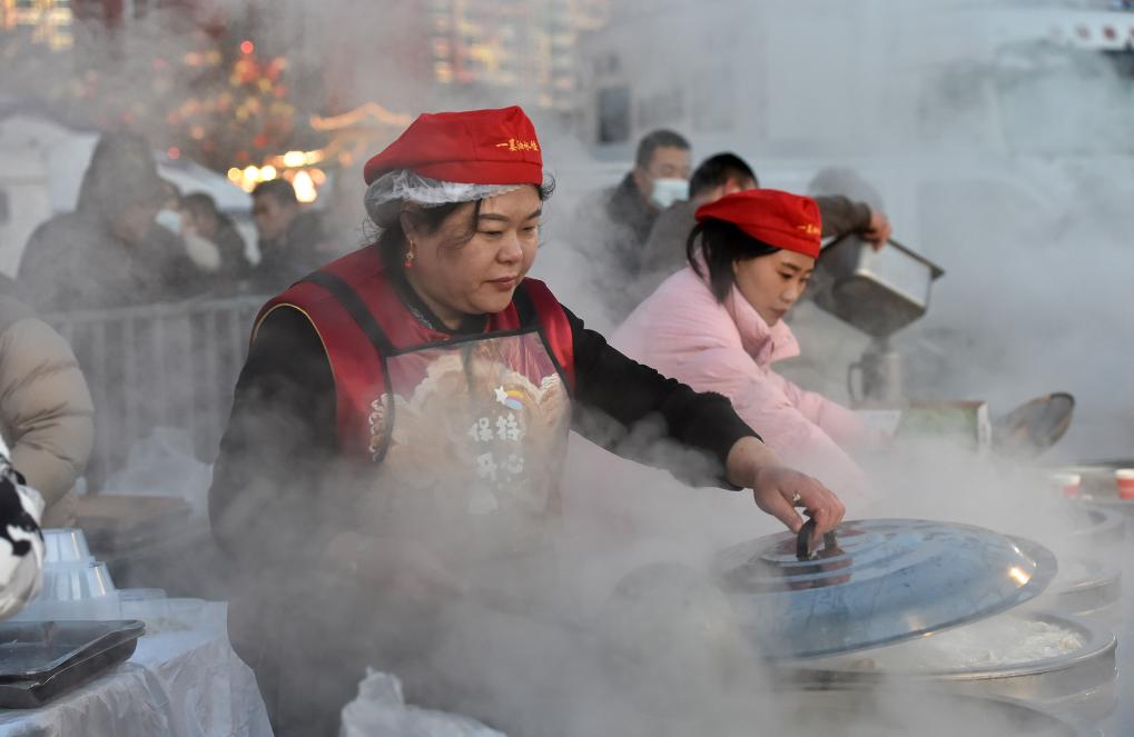 2025年12月31日,工作人员在美稷·长河里夜未央不夜城活动现场煮制惠民派送饺子。(吴潇莹 摄)