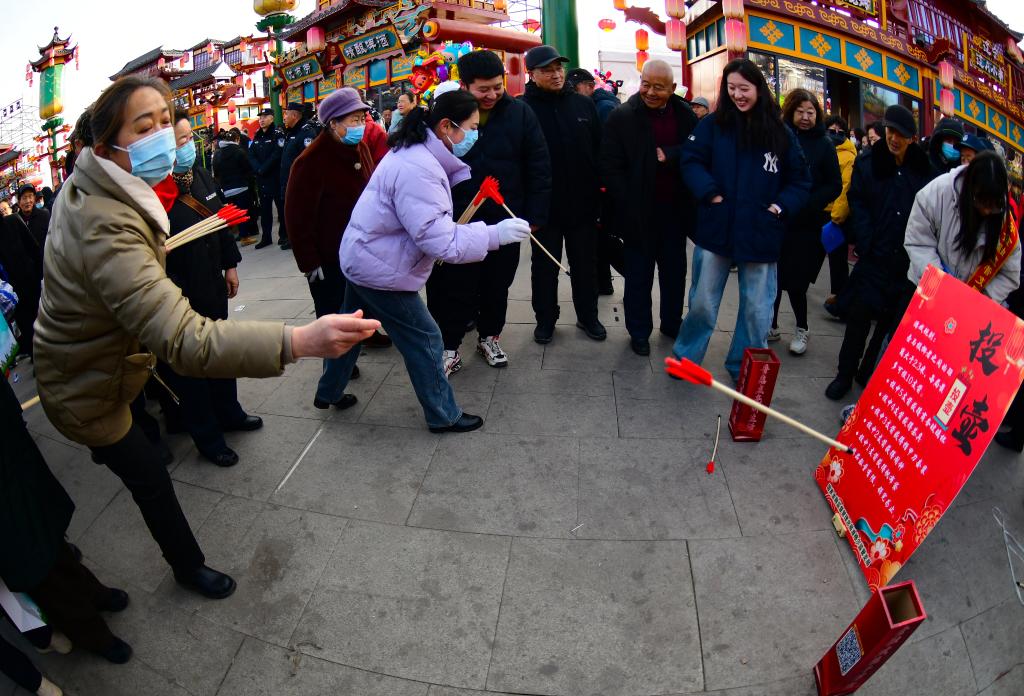 2025年12月31日,市民游客在美稷·长河里夜未央不夜城参与投壶有奖游戏。(康文魁 摄)