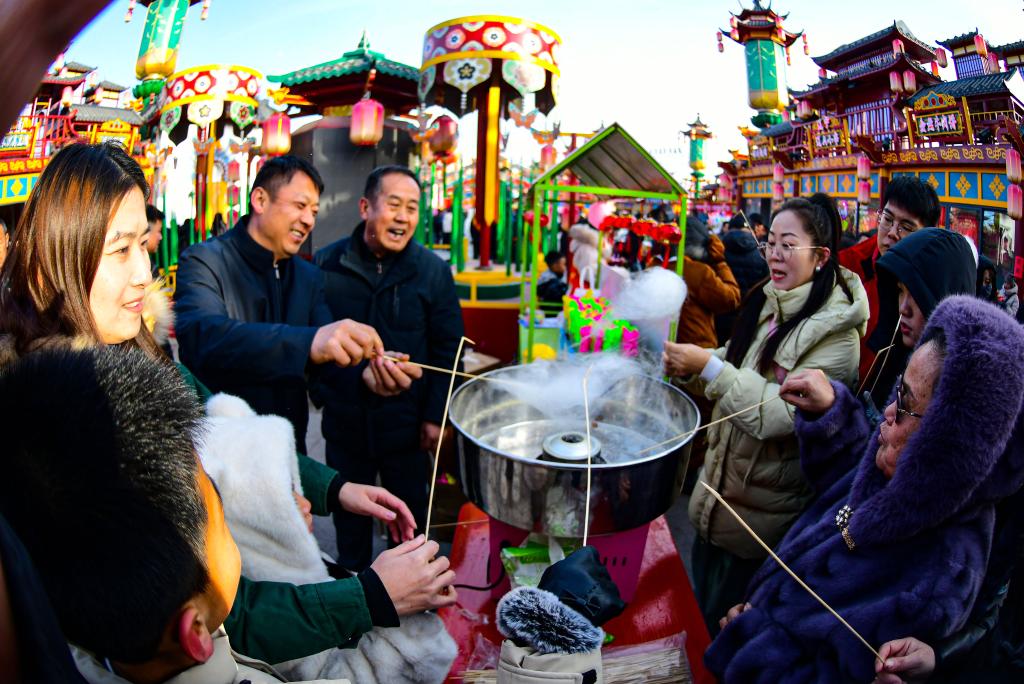2025年12月31日,市民游客在美稷·长河里夜未央不夜城体验棉花糖制作手艺。(康文魁 摄)