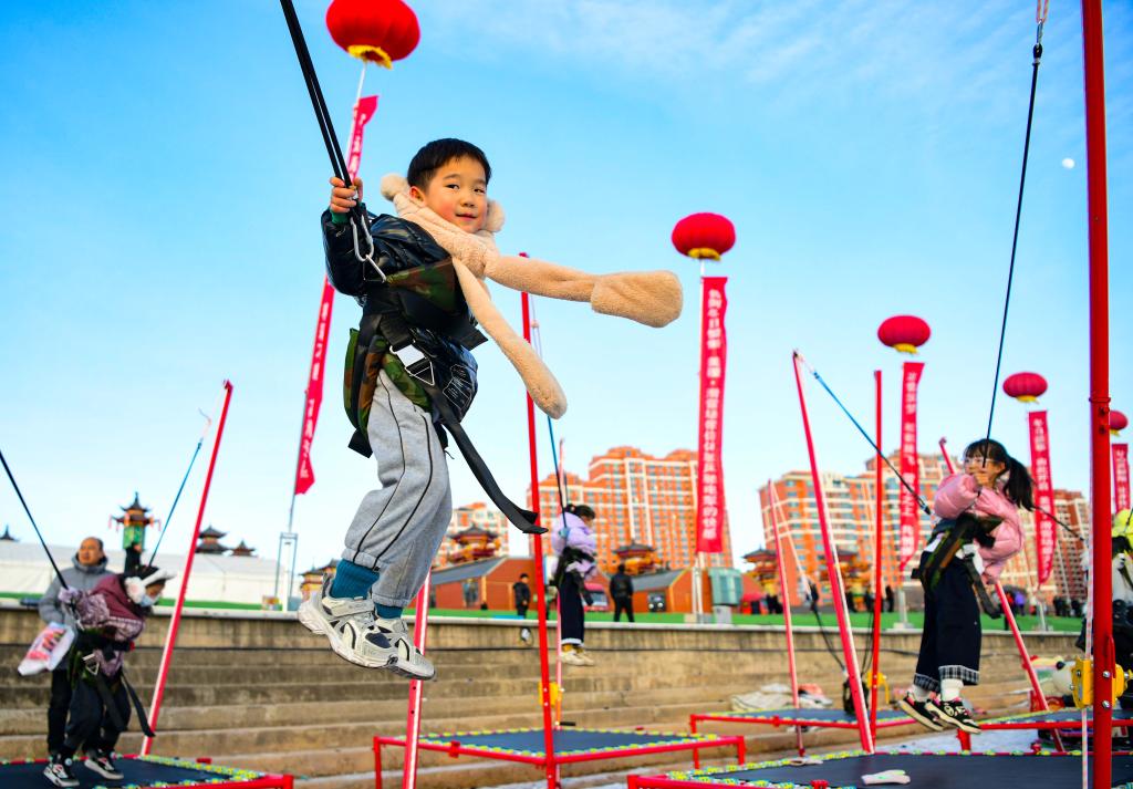 2025年12月31日,孩子们在美稷·长河里夜未央不夜城游乐场体验蹦床。(康文魁 摄)