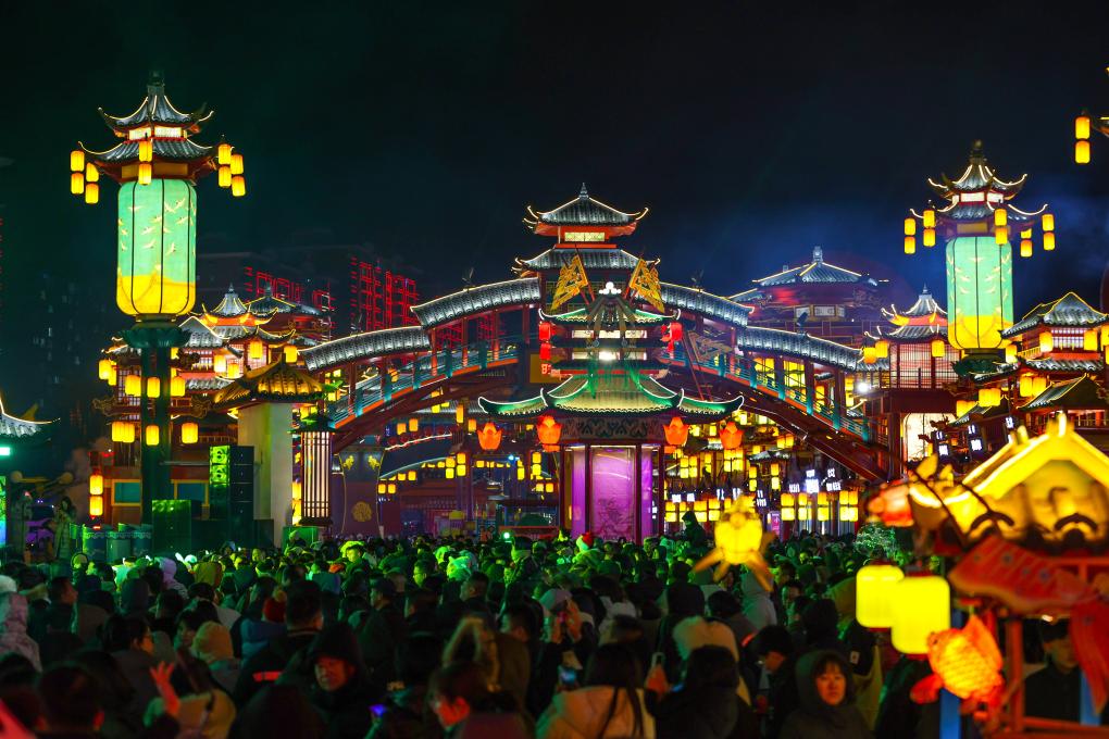 2025年12月31日,游客在美稷·长河里夜未央不夜城游玩。(吴潇莹 摄)