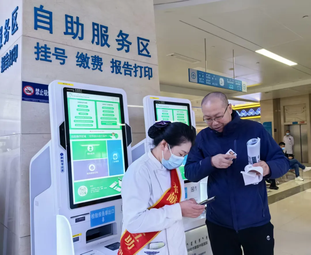 呼和浩特市中医蒙医医院导诊护士帮市民挂号。