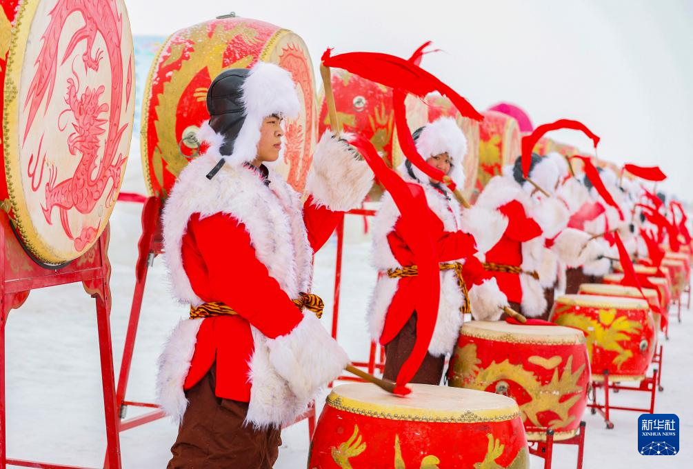 1月17日,演员在达里湖冬捕季开幕式上表演威风锣鼓。