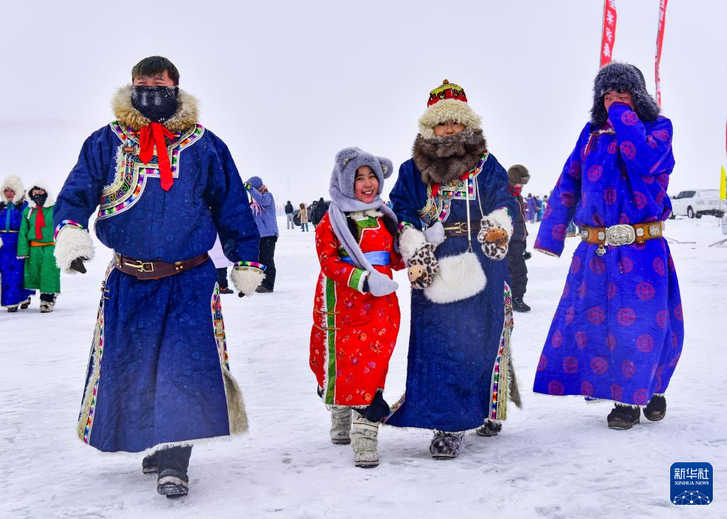 1月17日,人们身着民族节日盛装在达里湖冬捕季活动现场游玩。