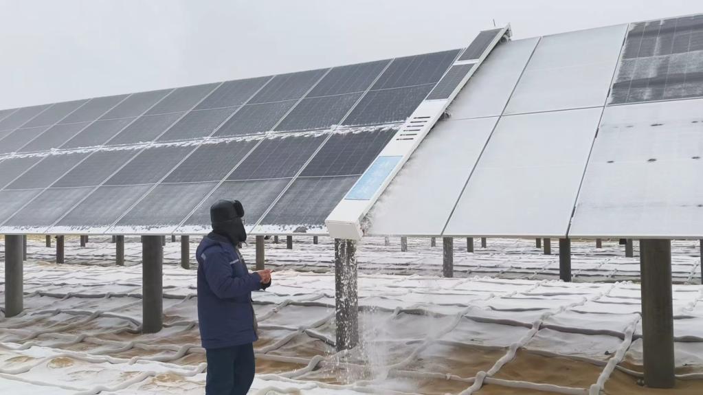 新华社呼和浩特1月18日电(记者魏婧宇)一场大雪过后,金色的腾格里沙漠又添了一抹洁白。迎着寒风,踏着积雪,内蒙古华电腾格里绿色能源有限公司的王耀强和同事来到沙漠中的一片光伏板附近,打开红外成像仪对着周围的光伏板进行检测,成像仪上显示出一片热斑。王耀强说:“有热斑说明这块光伏板出现了异常,我们要进一步检查是否需要更换。”