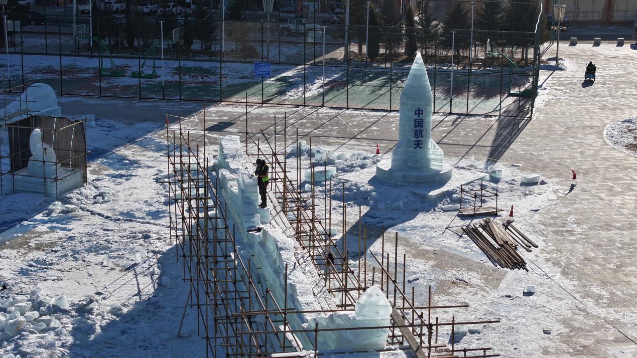 冰雕搭建工作正在进行。新华网发