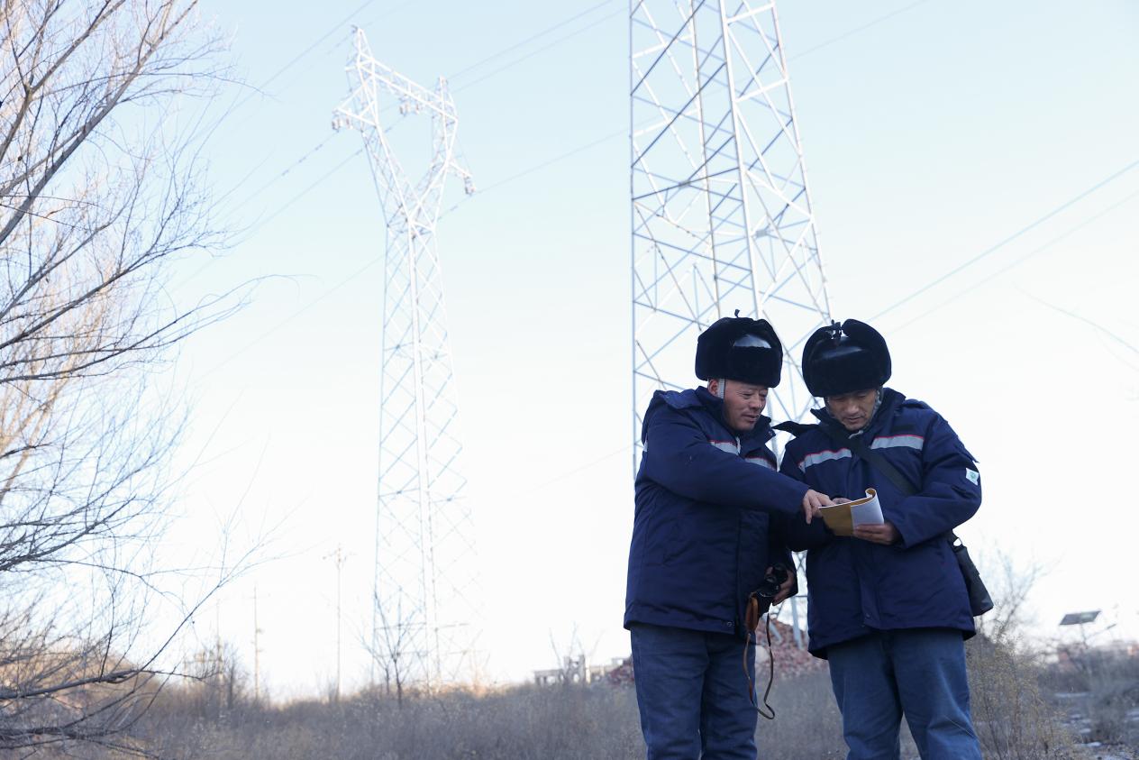 午时(11:00-13:00),日居中天,大地浸满阳光。供电中心员工在严寒天气下开展设备杆塔线路巡视工作。两名巡视人员身穿厚重防寒服,认真查看高压输电线路和杆塔的运行状况。冬季线路易结冰、覆雪,存在安全隐患,工作人员需沿线路细致排查,确保设备安全稳定运行。