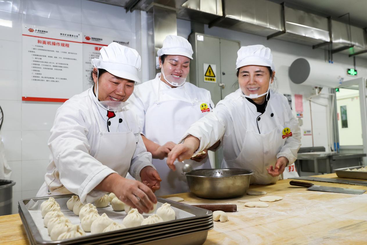 卯时(5:00-7:00),破晓的晨光时刻。矿业服务公司物资设备管理服务部伍佰座食堂的厨房已灯火通明。面案师傅正为员工们包包子,蒸腾的热气里包裹着后勤保障的温度。