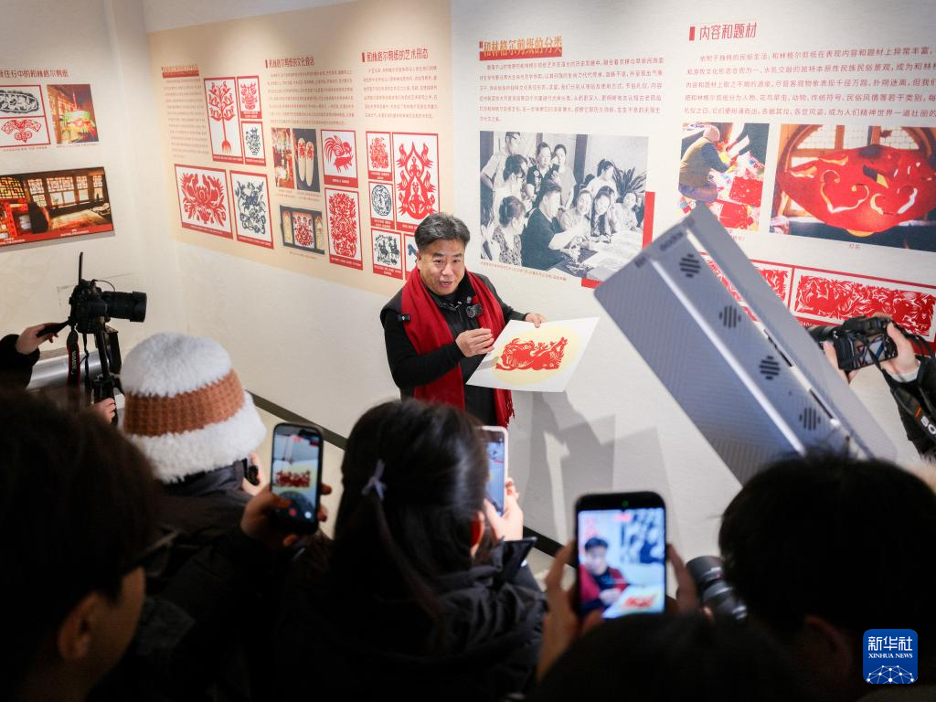 2月4日,和林格尔剪纸国家级非物质文化遗产代表性传承人段建珺(中)在内蒙古呼和浩特市和林格尔土城子国家考古遗址公园剪纸陈列馆向观众介绍和林格尔剪纸。新华社记者 马金瑞 摄