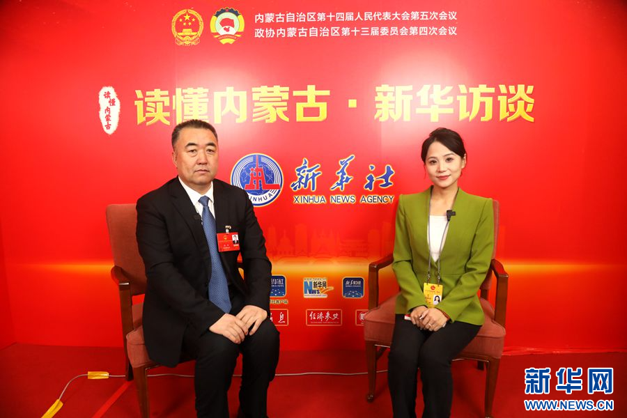 内蒙古自治区人大代表、兴安盟扎赉特旗委书记麒麟(左)接受新华网专访。新华网发