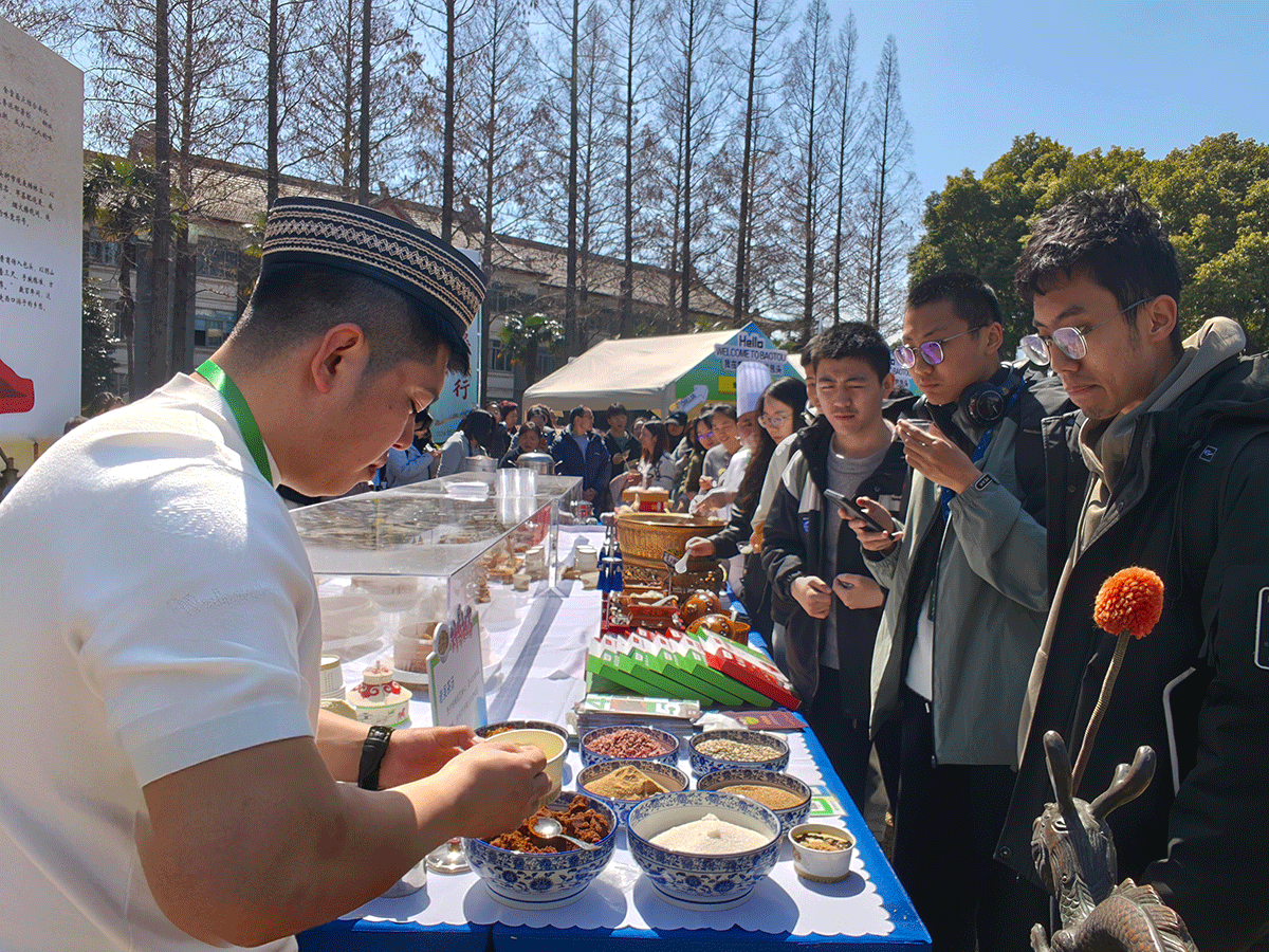 3月10日,在复旦大学邯郸校区校园内,学生们品尝包头美食“茶汤”。新华网 徐红梅摄