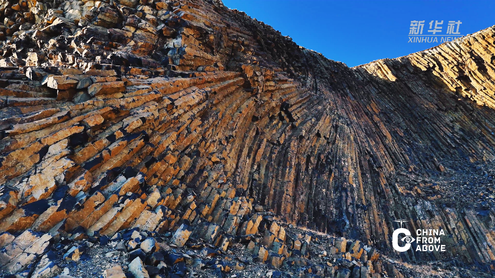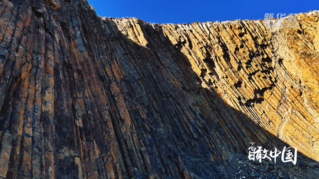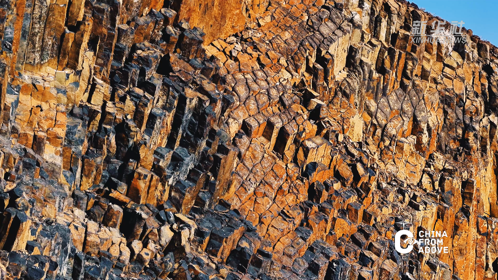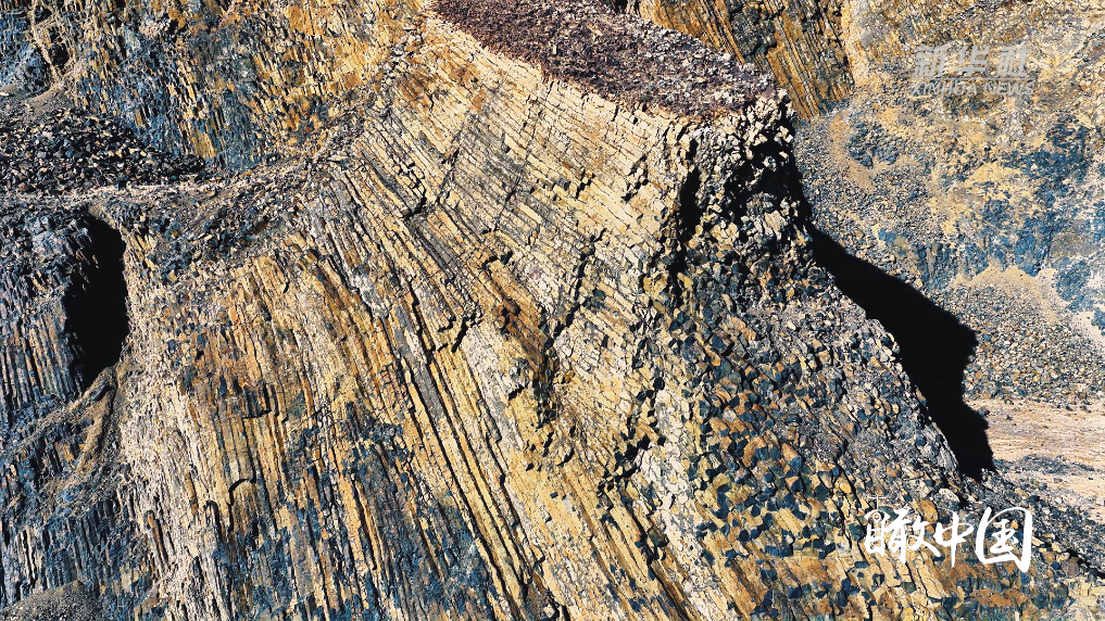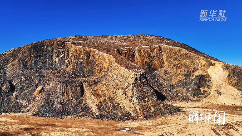 山体裸露的岩层呈现出罕见的同心放射状柱状节理,黑色玄武岩整齐排列,宛如巍峨城墙。岩柱纹理清晰、气势恢宏,完整记录了远古火山运动的地质变迁。