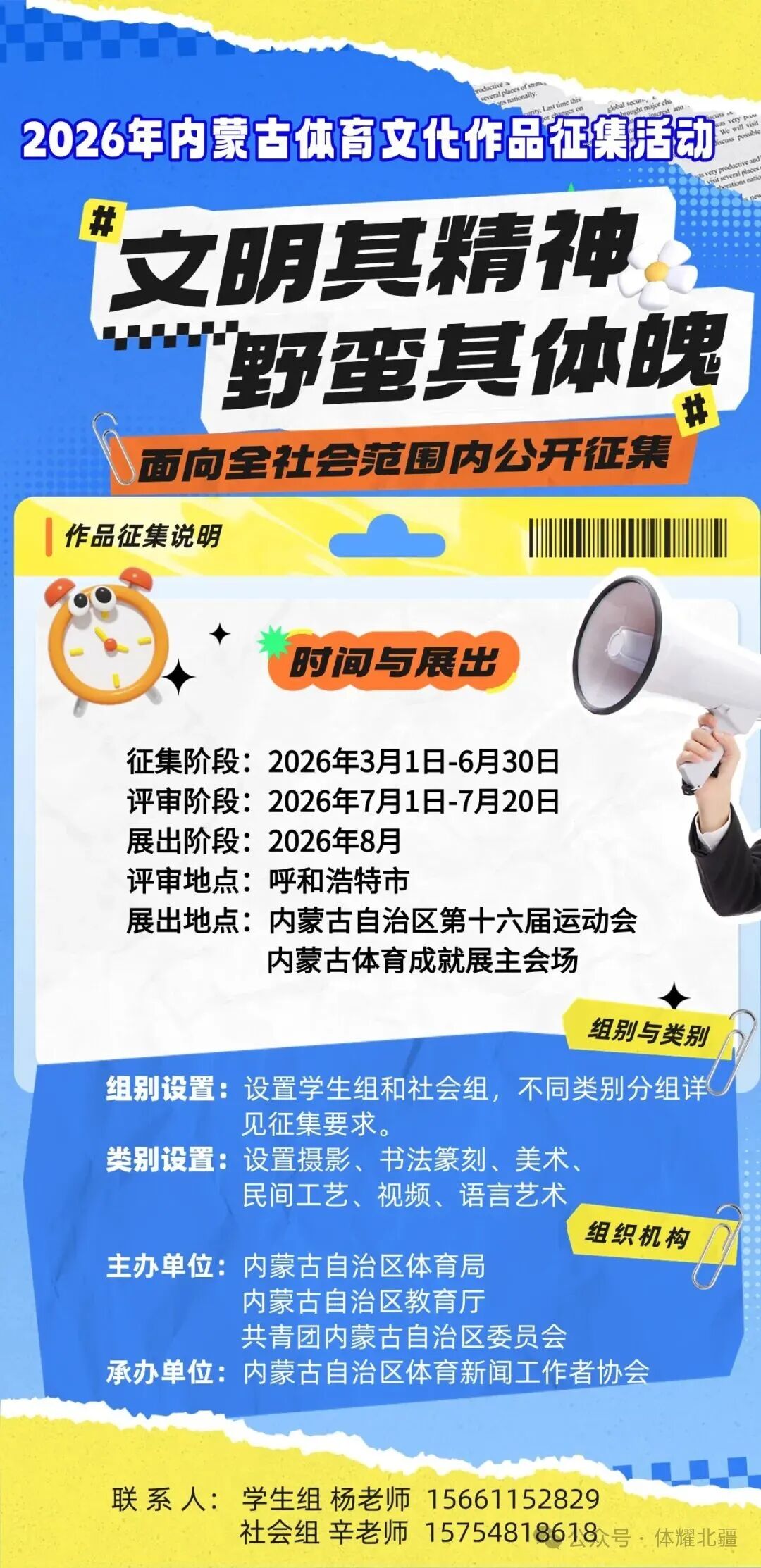 为大力弘扬中华体育精神,生动展现内蒙古自治区蓬勃发展的体育事业、深厚的体育文化底蕴以及各族人民在体育运动中展现的团结拼搏、积极向上的精神风貌,现就开展2026年内蒙古体育文化作品征集活动通告如下。