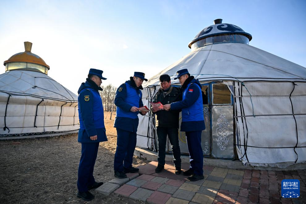 3月18日,西乌珠穆沁旗消防救援大队消防指战员向牧民乌力吉达来(右二)宣传消防安全知识。