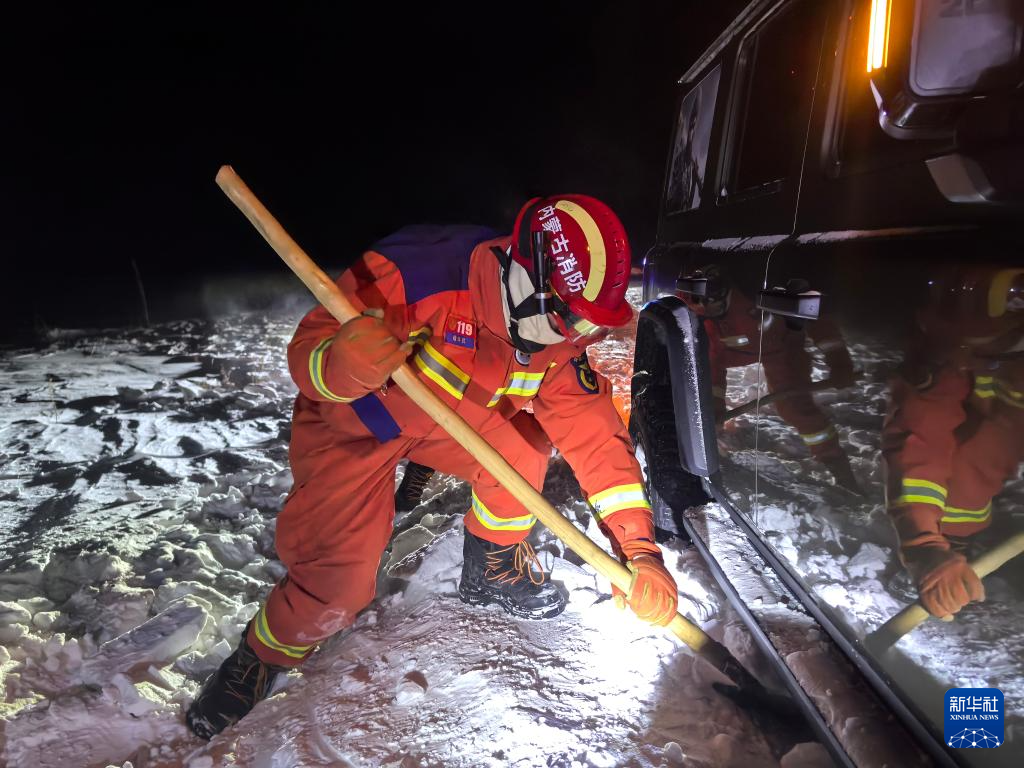 西乌珠穆沁旗消防救援大队消防指战员在营救被困车辆(2025年1月19日摄)。