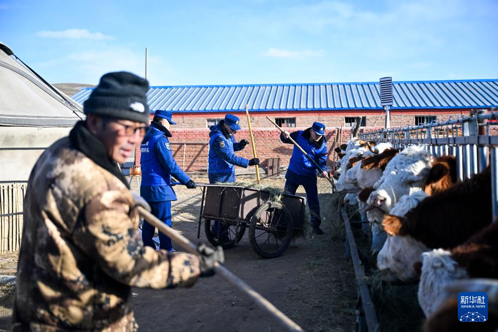 3月18日,西乌珠穆沁旗消防救援大队消防指战员帮助牧民吉日嘎拉(左)给牛喂草料。