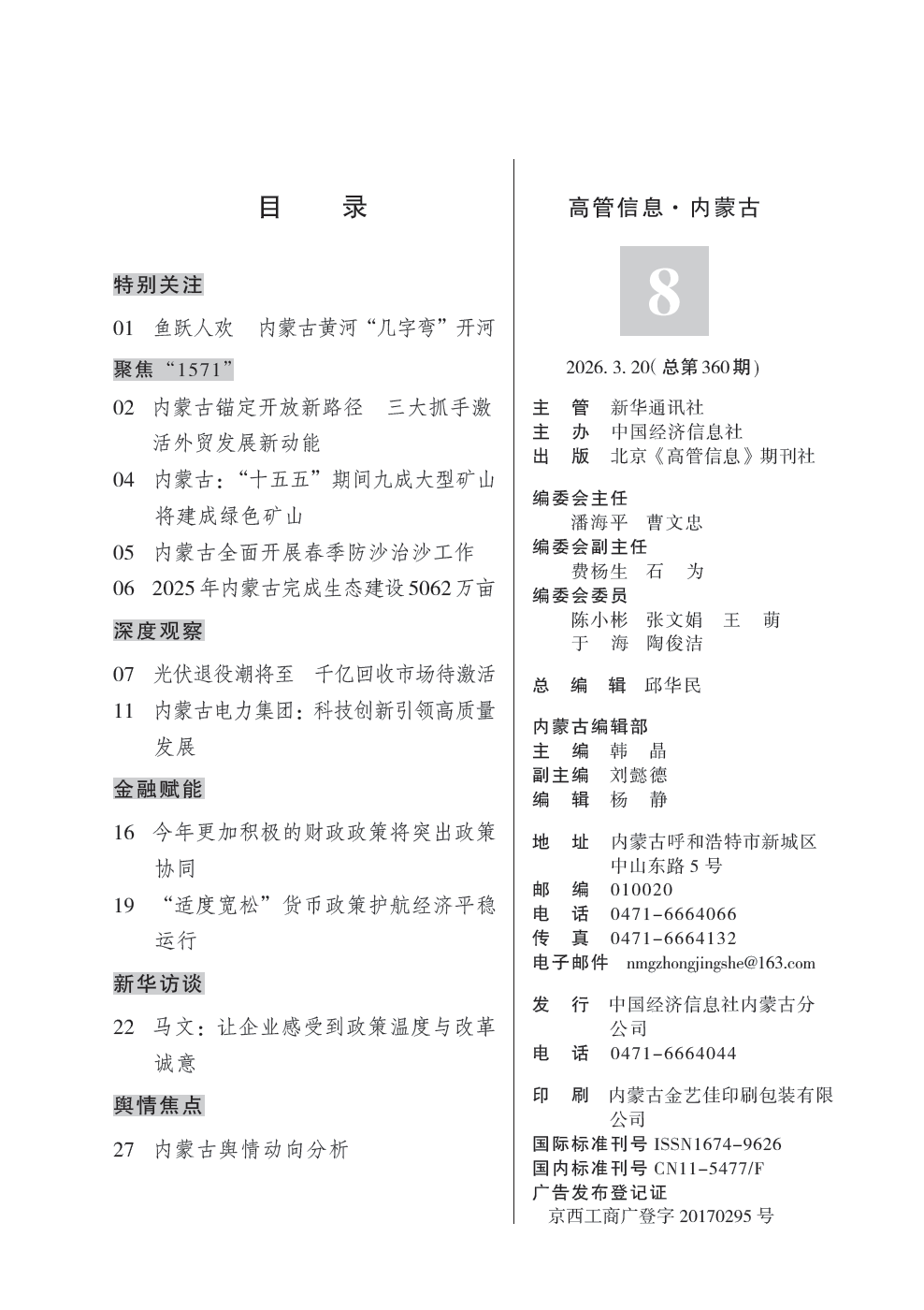 《高管信息·内蒙古》立足内蒙古在全国发展大局中的战略定位,以做好经济宣传引导为重点,致力于为奋力书写中国式现代化内蒙古新篇章提供智库服务。