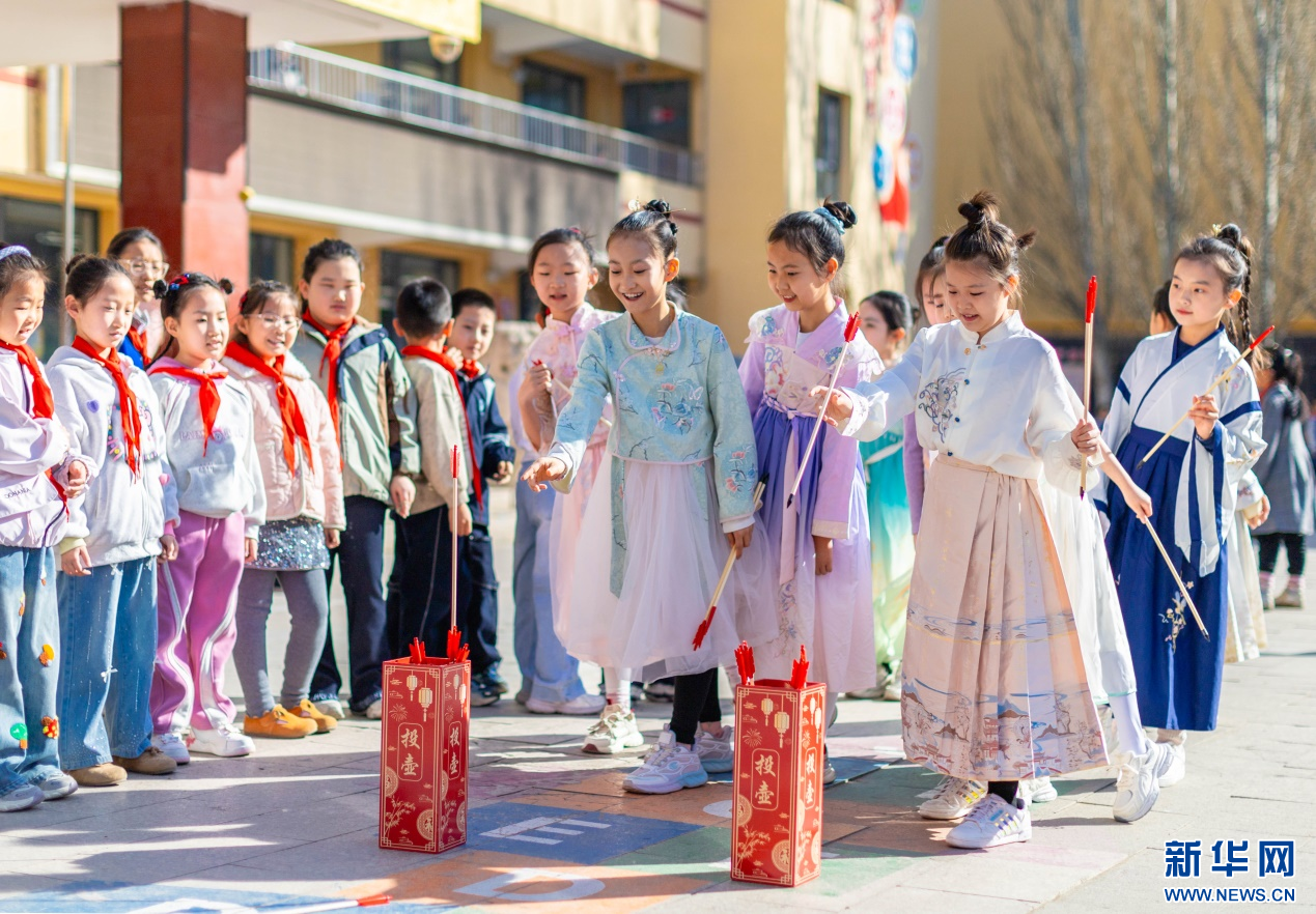 4月2日,在呼和浩特市玉泉区清泉街小学清明节主题活动现场,学生们在玩投壶游戏。新华网发(丁根厚 摄)
