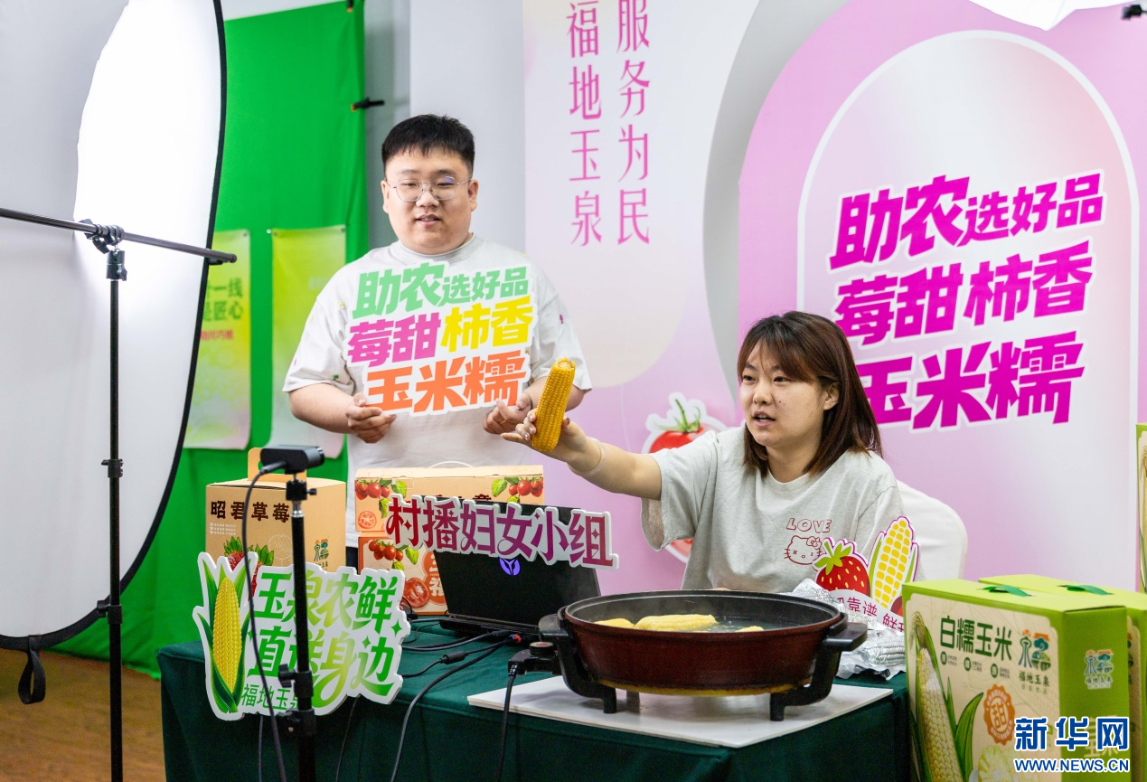 4月13日,呼和浩特市玉泉区妇联“村播妇女小组”的创业者通过电商平台直播销售当地特色农产品。新华网发(丁根厚 摄)
