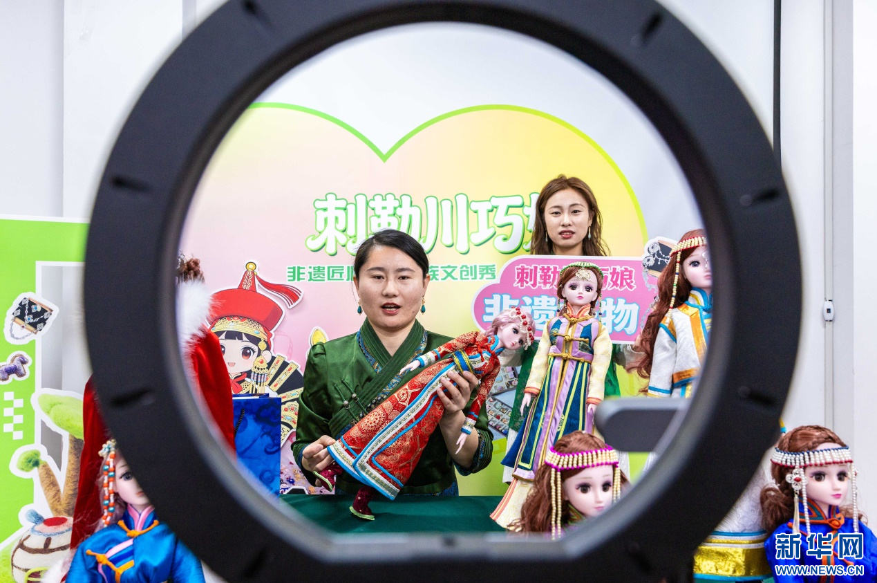 4月13日,呼和浩特市玉泉区妇联“村播妇女小组”的创业者在直播销售“敕勒川巧娘”民族特色非遗好物。新华网发(丁根厚 摄)