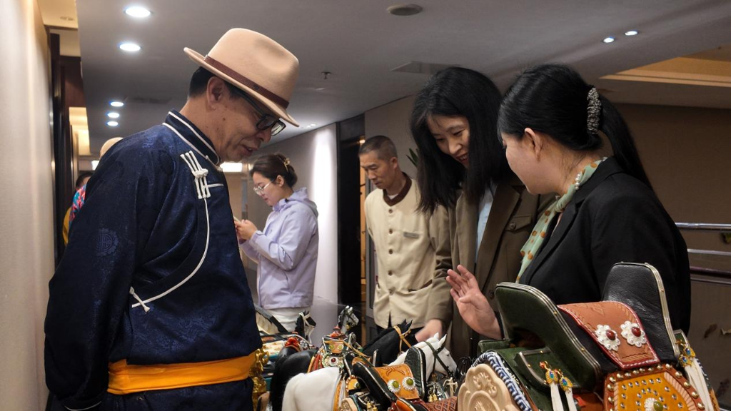 会场另一侧,非遗文创和农特产品展区人头攒动。蒙古族马具制作技艺传承人、皮雕传承人演示精美的手工作品,安牧态奶食品的奶皮卷、手撕奶酪等20多种产品供市民品尝,让大家近距离感受科尔沁草原的独特风味与文化魅力。