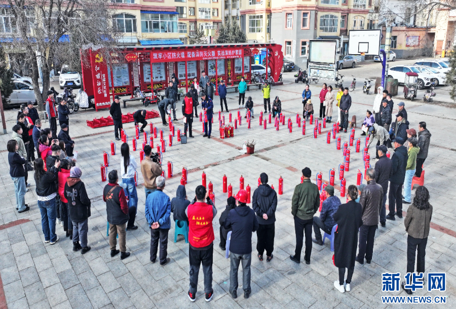 4月20日,在内蒙古自治区扎兰屯市正阳街道办事处红旗社区,消防队员指导社区居民正确使用消防灭火器材。新华网发(韩颖群 摄)
