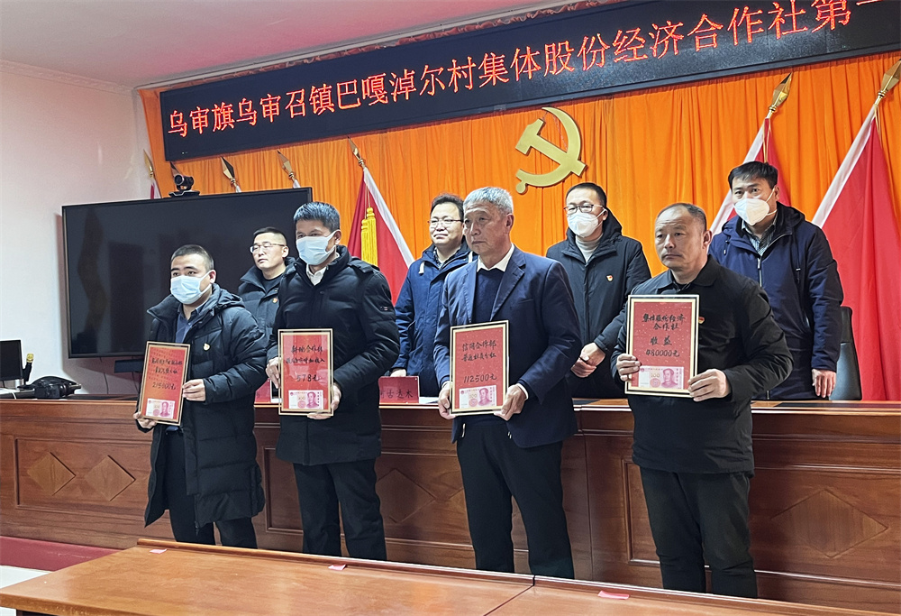 乌审旗乌审召镇巴嘎淖尔村集体经济股份合作社社员喜领分红款。