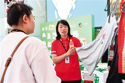 | 工作人员向消费者介绍用回收的饮料瓶加工成的服装 |
