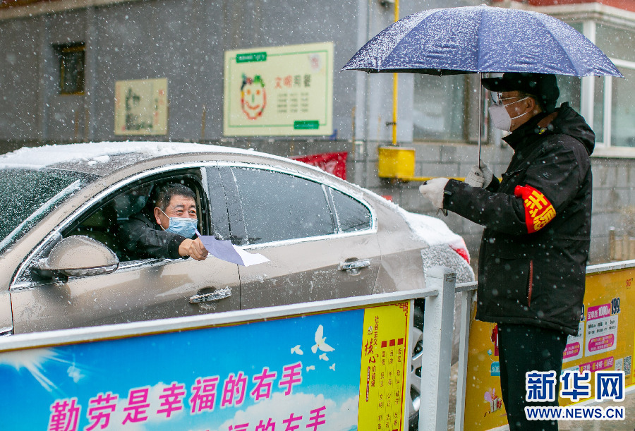 3月17日,党员志愿者在呼和浩特市玉泉区警备区小区对出入小区的车辆和人员进行查验。新华网发(丁根厚 摄)