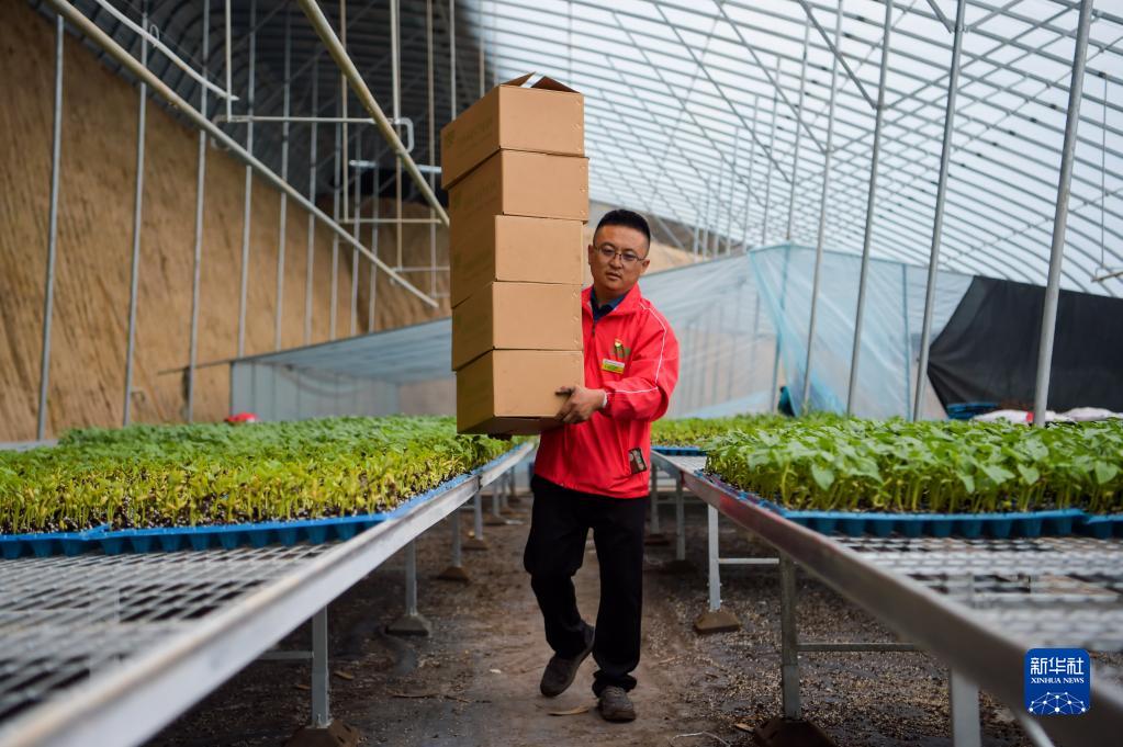 3月23日,工人在位于呼和浩特市赛罕区的蒙苗农业蔬菜育苗基地搬运蔬菜种苗。