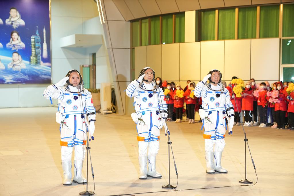 据中国载人航天工程办公室消息,11月29日20时18分,神舟十五号载人飞行任务航天员乘组出征仪式在酒泉卫星发射中心问天阁圆梦园广场举行。航天员费俊龙(中)、邓清明(右)、张陆在出征仪式上。