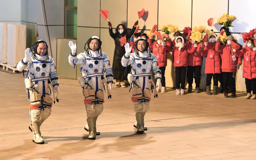 据中国载人航天工程办公室消息,11月29日20时18分,神舟十五号载人飞行任务航天员乘组出征仪式在酒泉卫星发射中心问天阁圆梦园广场举行。航天员费俊龙(中)、邓清明(右)、张陆在出征仪式上。