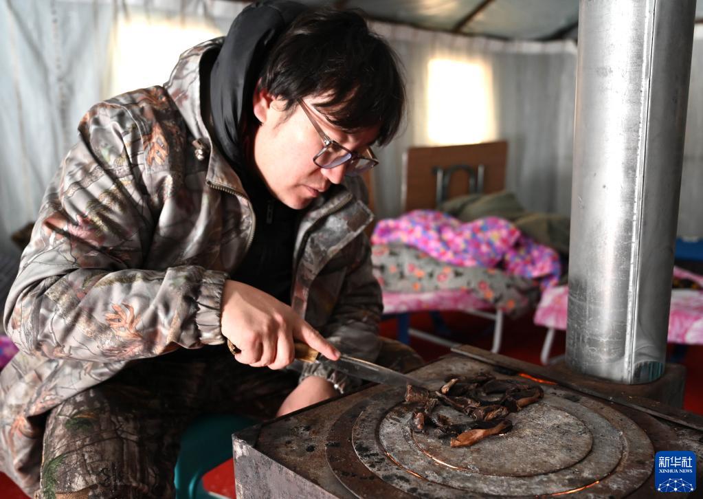 1月12日,觉乐在帐篷里的火炉上烤肉干。新华社记者 任军川 摄